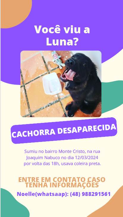 A LUNA ESTÁ DESAPARECIDA A UMA SEMANA, O INTERVA-LO DE TEMPO ENTRE ELA FUGIR E SER NOTADO O SEU DESAPARECIMENTO FOI DE ALGUNS MINUTOS, PORTANTO ACREDITA-SE QUE ALGUÉM A PEGOU, MAS A CAMERA DE SEGURANÇA NÃO CONSEGUIU FILMAR A AÇÃO, DE TODA FORMA MINHA CACHORRA FOI PERDIDA NO MONTE CRISTO, APESAR DE SER VIRALATA(SRD) ELA ESTAVA BEM CUIDADA E CRIADA E TINHA UMA APARENICIA QUE MUITOS ACHAVAM QUE ELA TINHA UMA RAÇA, ELA TAMBÉM É CASTRADA E TEM MICROCHIP PELA PREFEITURA DE FLORIANOPOLIS, ENTÃO SE ALGUEM ENCONTRA-LA OU VER QUE ALGUM VIZINHO ADOTOU UM CACHORRO NOVO COM ESSAS CARACTERISTICAS POR FAVOR ENTRAR EM CONTATO.