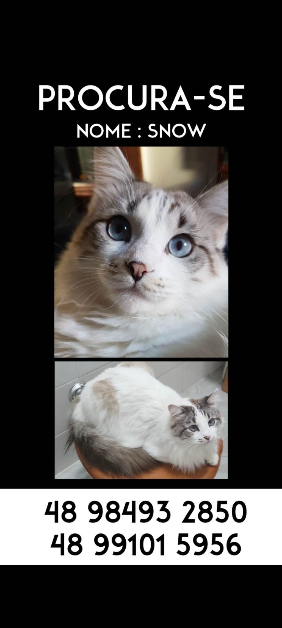 Procura-se gato perdido. Snow, um gato da raça Ragdoll, desapareceu no dia 2 de outubro de 2025. Ele é um macho de porte médio e tem 5 anos de idade. Sua pelagem é predominantemente branca, com distintivas manchas cinzas. Seus olhos são azuis intensos, e o rabo lembra um espanador cinza devido à sua pelugem exuberante.